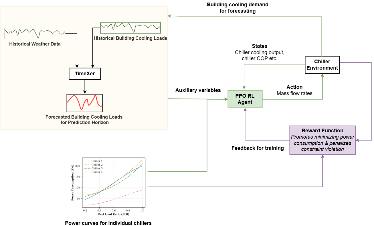 This thesis presents a deep reinforcement learning optimization framework for multi-chiller energy management applied to the University of Queensland's Advanced Engineering Building chiller bank. The approach employs a Proximal Policy Optimization (PPO) agent operating within a receding-horizon structure to regulate chilled water mass flow rates across four chillers while maintaining consistent supply temperatures. Key innovations include a heterogeneity-aware reward formulation capturing individual chiller efficiency characteristics and a TimeXer transformer-based forecasting model incorporating historical demand patterns and weather variables for improved prediction reliability.