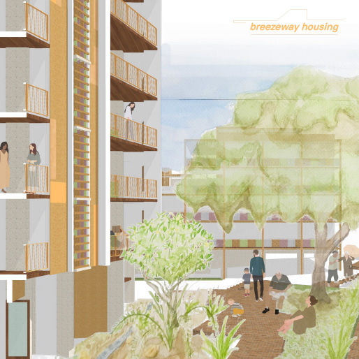 Breezeway Housing emulates a housing development that is socially sustaining for communities and that protects and promotes natural environments as part of Brisbane’s subtropical identity. It presents a counter-position to the current conventional default of high-rise concrete towers spreading through the inner city, overshadowing streets, blocking views, and further diminishing the remaining fragments of the city’s green spaces.