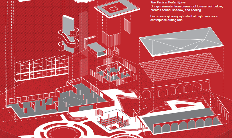 This project reinterprets Le Corbusier’s vision of Chandigarh’s Leisure Valley for a new ecological century. Set along the N-Choe’s natural depression, the Urban Ecological Interpretation Center transforms water, landscape, and architecture into a unified civic experience. Rather than treating water as hidden infrastructure, the design celebrates it as a public protagonist—surfacing it through rain chains, reservoirs, bioswales, and seasonal sponge gardens that reveal the rhythms of monsoon, drought, and everyday life.