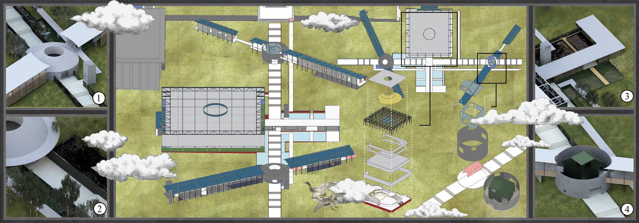 Working with the grid, two building masses emerge from the informal paths, juxtaposed and disrupting the rigid organisation of the site and forming pockets of protected in-between space. These spaces are programmed for studying, events, and outdoor activities that respond to the needs of the surrounding buildings.