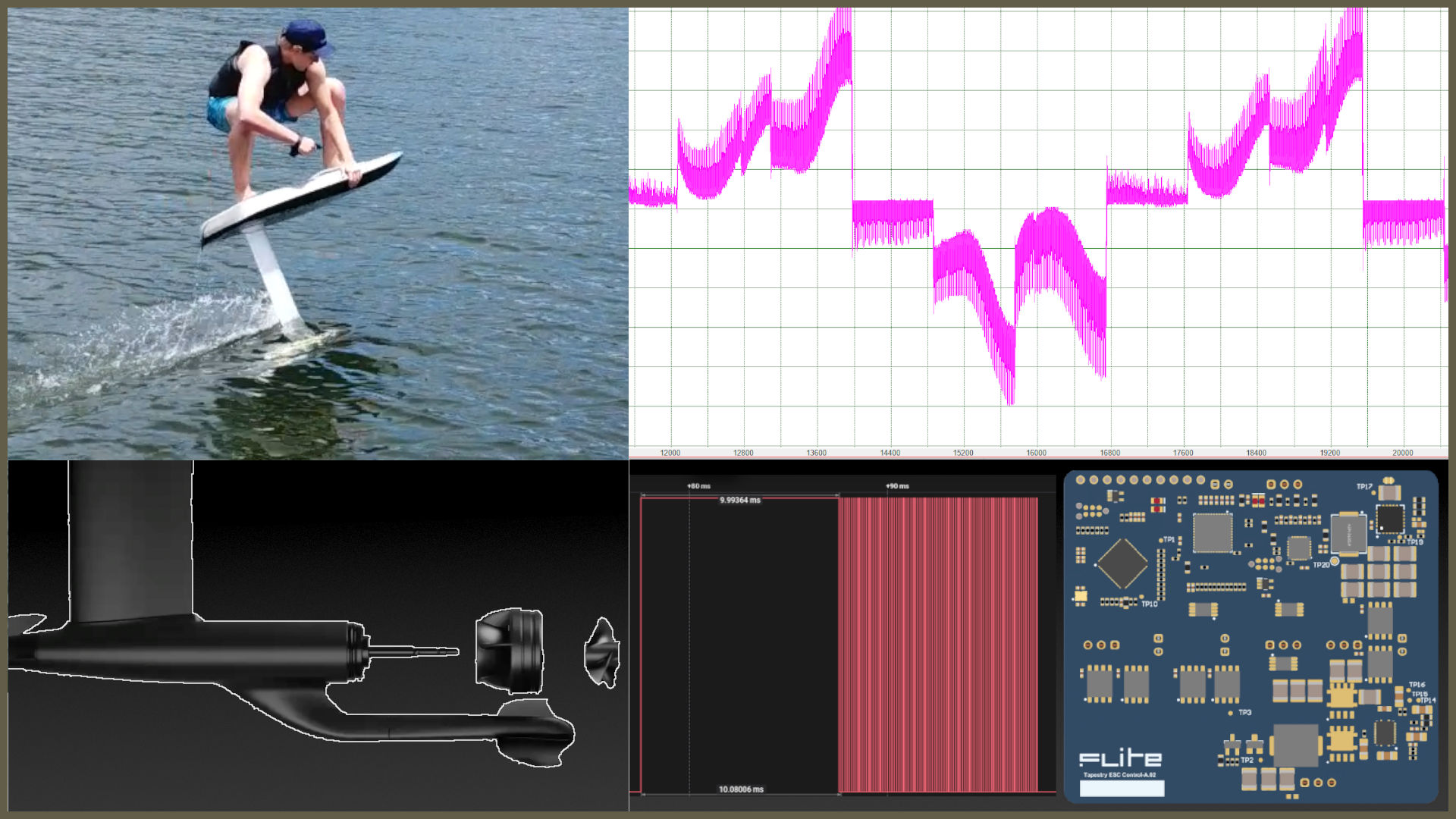 Many projects involving brushless electric motors simply buy a controller off-the-shelf, but it is believed that by creating a custom in-house solution, valuable performance gains can be made by tuning the controller specifically for hydrofoils. The Flite ESC project has been in the works, starting with the hardware design by Sebastian Bilios for his thesis (now a UQ graduate and Flite engineer) and the controller software/firmware by Matthew Hoffman as his thesis.